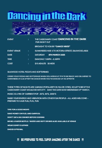 - SATURDAYS (next Dance to be announced) AT SUNNYBEES HUB 7PM TO 8.30PM: *